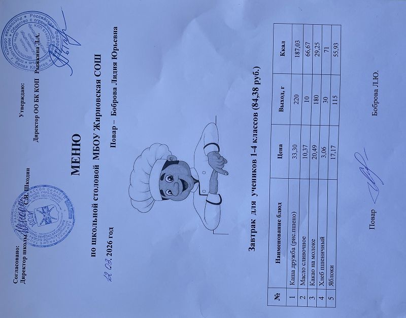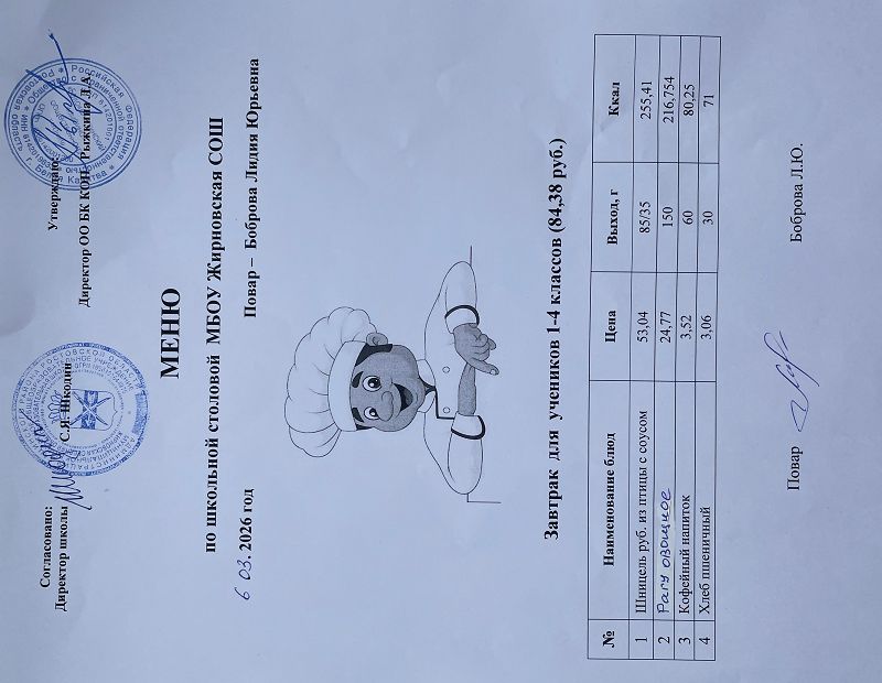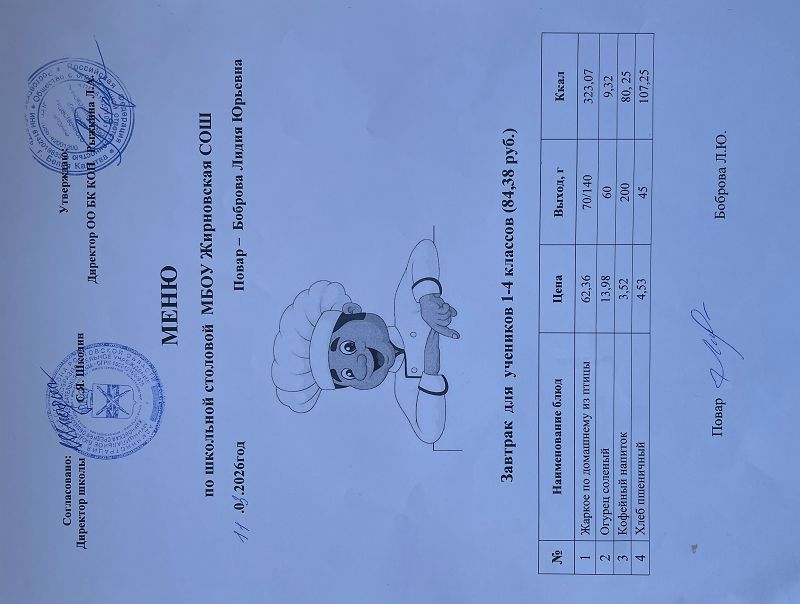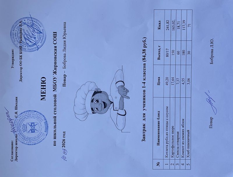 Скачать этот файл (Meniu_6050_Rub_Zhirnovskaia_SOSh.PDF)Примерное меню. Обед для детей с ОВЗ 1-4 классов на 2022г на сумму 60.50 руб (pdf, 861.8 Кб)