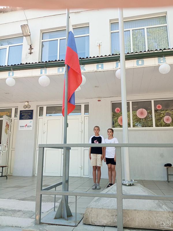 - Линейка, поднятие флага РФ, исполнение гимна.